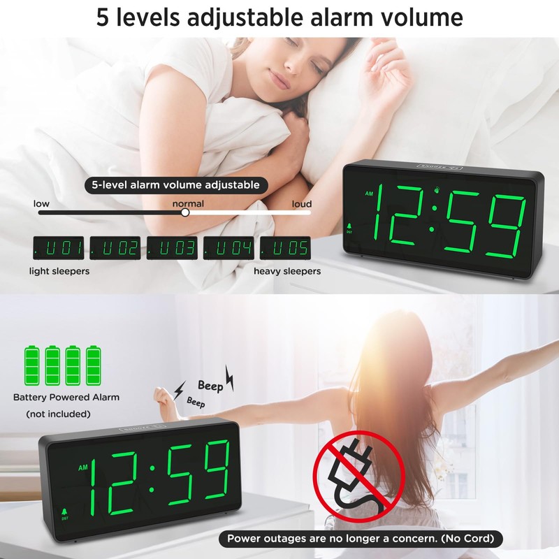 Peakeep Battery Operated Digital Clock, Alarm Clock for Bedrooms - Cordless Large Big Numbers 4 Dimmers for Seniors, Adjustable Volume Loud Alarm Clock for Heavy Sleepers Adults (Green Digits)