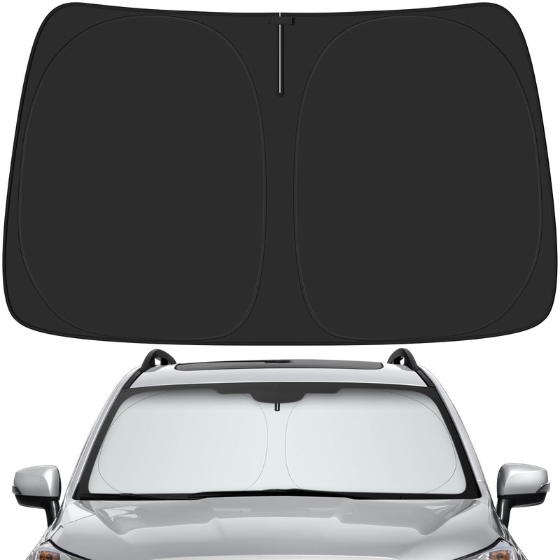 - Made from high-quality 240T reflective polyester, this windshield sunshade efficiently blocks both heat and sunlight, helping keep the inside of your vehicle cool. Its upgraded aluminum alloy memory frame enhances flexibility, making it easy to settle into the windshield while also facilitating simple folding and retraction.