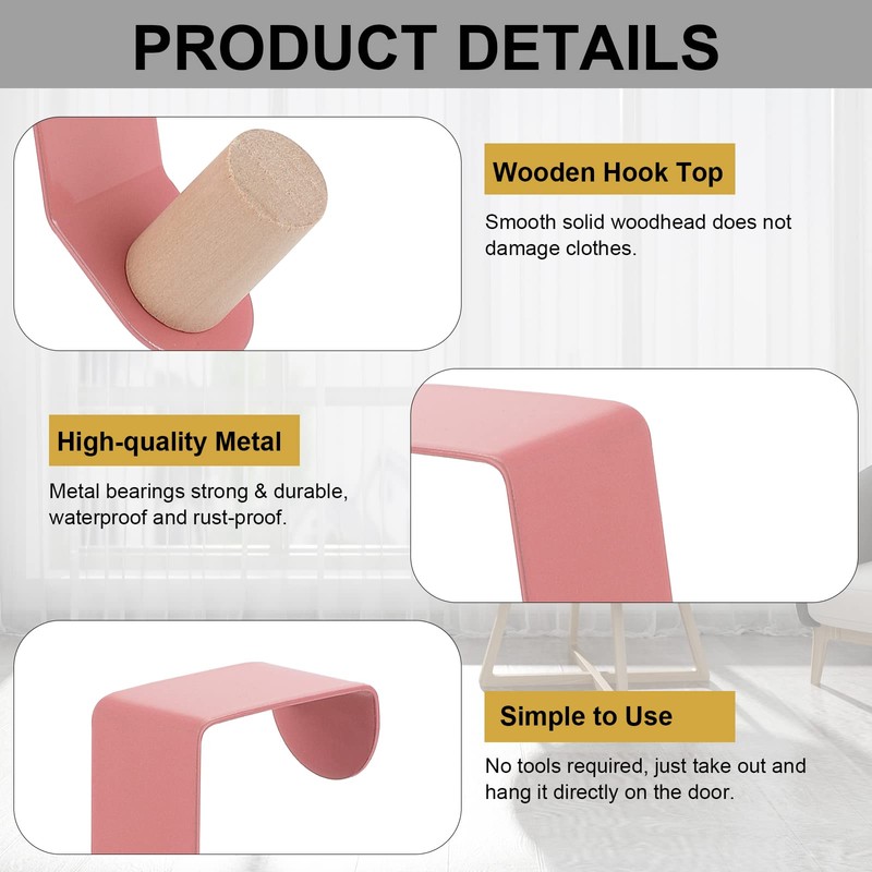 - Heavy metal: made of high-quality metal with finish, the door hook set of 4 holds up to 6.6 lbs. The specially developed coat hook door inside has a wooden ball at the tip that does not damage clothes.