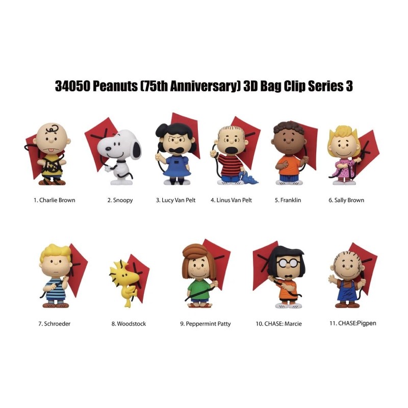 Collect your favorite Peanuts characters! Clip them on your keys, purse, backpack -- just about anywhere! Each figure measures about 2- 3 inches tall. Comes with mylar bag.