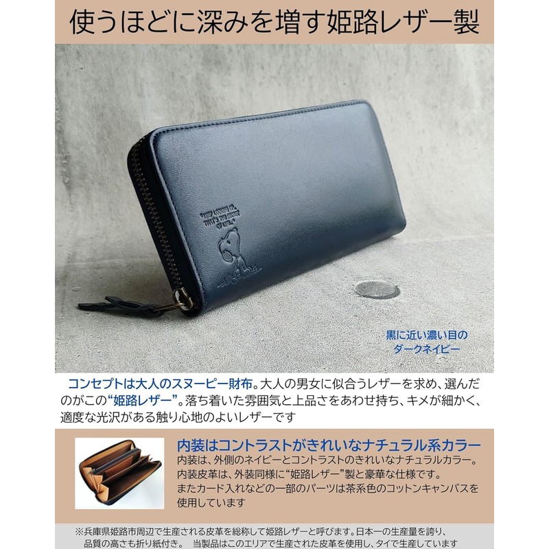 Peanuts Snoopy Wallet, Adult Long Wallet, Himeji Leather, Round Zipper, Large Capacity, Genuine Leather [90940] (Navy)