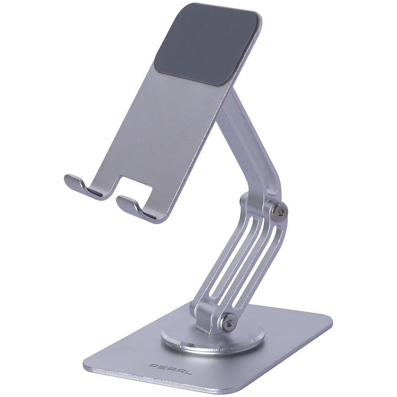 - Adjustable arm for smartphones and tablets Practical design: 360° rotatable Height adjustable: 3 axis heights and angles individually adjustable Material: aluminium with soft-touch shelf