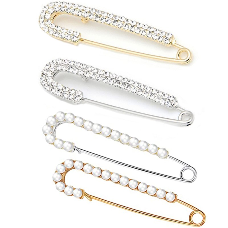 Pearl Brooch Safety Pin Brooch Clips Jumper Crystal and Pearl Pins and Crystal Shawl Clips Faux Scarf Coat Jewellery Pin Pack of 4 for Women Girls Clothing Decoration Accessories Jewellery, Stainless