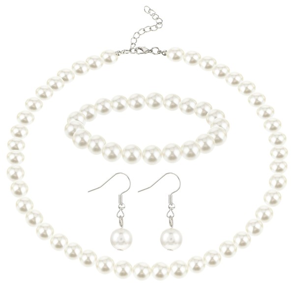 Pearl Necklace and Earring Set White Pearl Jewelry Set for Women Fashion Classic Faux Pearl Necklaces For Women Brides Wedding Pearl Necklace Kit (8mm Necklace+10mm Earring Bracelet)