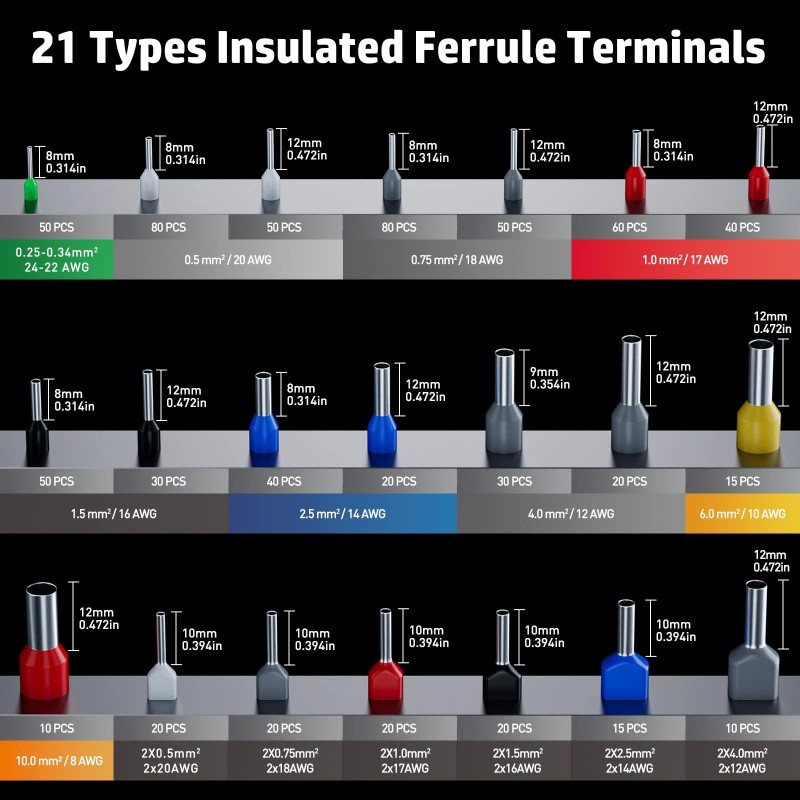 Ferrules Crimp Kit: Contains 21 sizes of ferrule and twin ferrules AWG 24-8/0.25–10mm² wire terminals, enough in quantity and different lengths to meet your various needs, and Ferrule Crimping Plier (Quadrilateral), all organized in one compact box for versatile applications and easy storage.