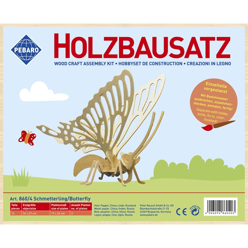 Pebaro 860/4 Holzbausatz Schmetterling, 3D Puzzle, Modellbausatz, Basteln mit Holz, Holzpuzzle Tier, vorgestanzte Holzplatte, inkl. Schmirgelpapier, ausbrechen, zusammenstecken, fertig, Geschenkidee