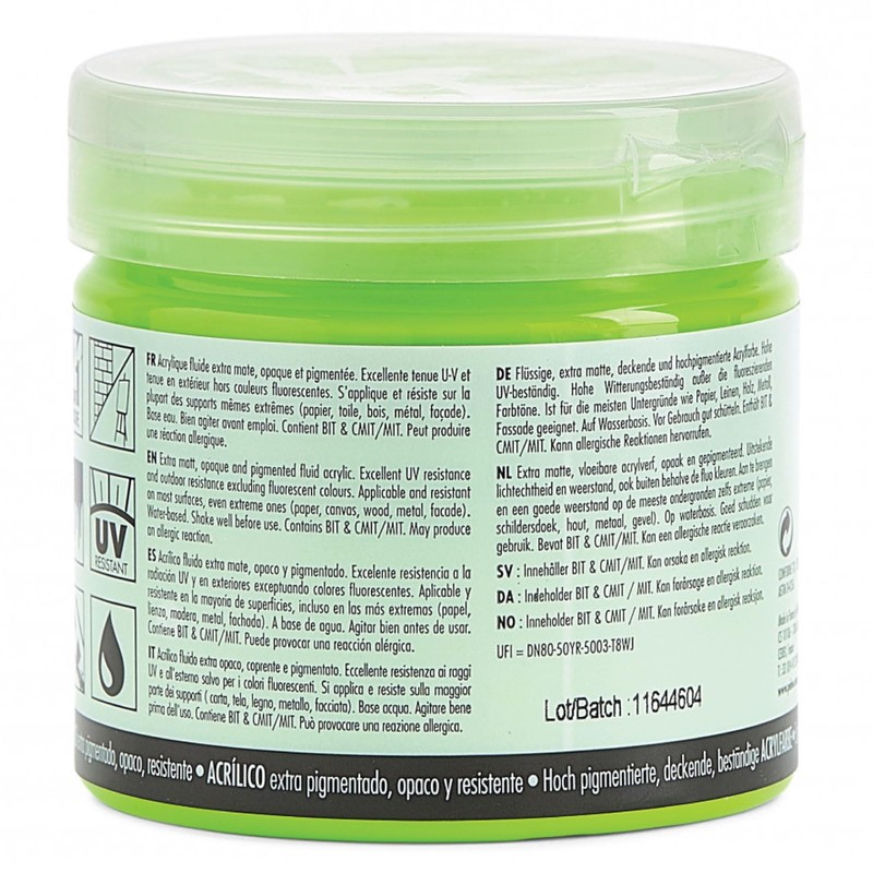- Liquid, extra fine acrylic paint in highly concentrated, opaque and adhesive colours with an ultra-matte finish