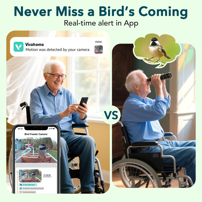 - 【AI Bird ID & 4-Person Sharing】Our bird feeder uses VicoHome App and has AI to recognize 10,000+ bird species—try it free for 30 days (subscription required afterward). Share the joy with family—the bird house with camera supports 4 simultaneous viewers! Ideal bird watching gifts for families or birding enthusiasts