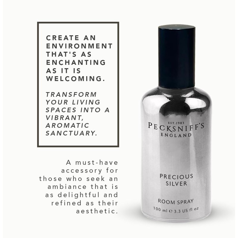 Discover the secret to a continuously inviting and refreshing home atmosphere with just a simple spray. Pecksniff's Precious Silver Room Spray is not just about the scent; it's about creating an experience. Whether you're looking to unwind after a long day or impress guests with your impeccable taste, this room spray is the perfect choice. Its beautifully designed bottle also makes it a charming addition to any room, blending seamlessly with your decor while standing as a testament to your discerning eye for quality.