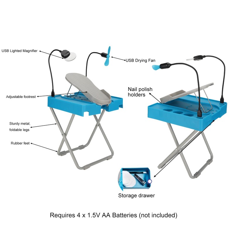 - [FAN AND MAGNIFIER WITH LIGHT] - Speed up the drying of nail polish with the silent fan included in this pedicure foot rest kit. The magnifying glass with light provides enhanced visibility in low light areas.