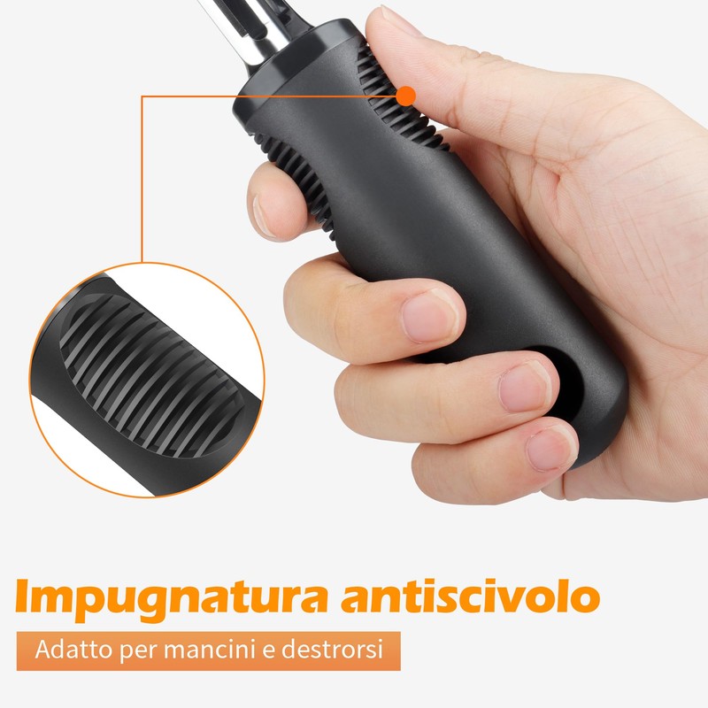- Ergonomic handle made of high-quality silicone always sits comfortably in the hand. It is suitable for right and left-handed users and is cleaned in the dishwasher after use.