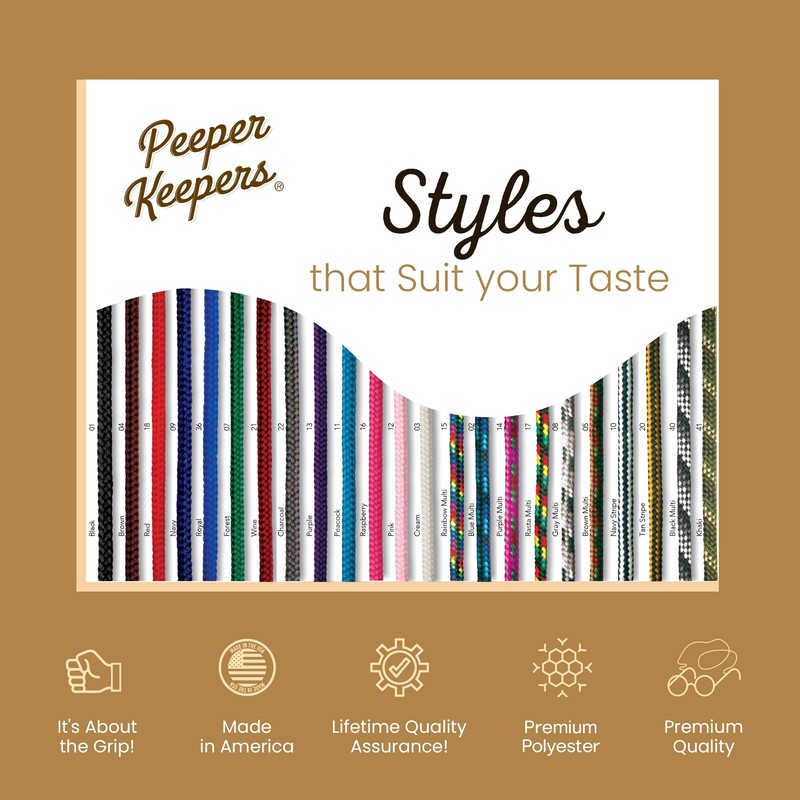 - ✔️ PEEPER KEEPERS SUPERCORD: It won't irritate the skin, is long lasting, and available in many vibrant and aesthetically pleasing colors.Fits most pairs of glasses, including reading glasses, sunglasses, and eyeglasses. Cord is 27 inches in length, the perfect length to keep your glasses out of the way, yet easily accessible. Peeper Keepers offers many great styles and color combinations for both men and women