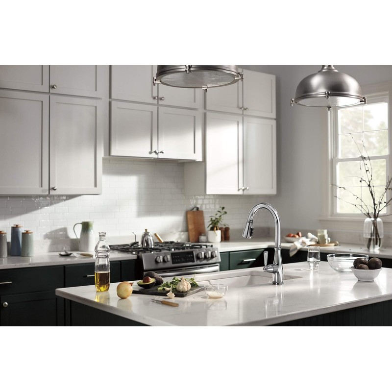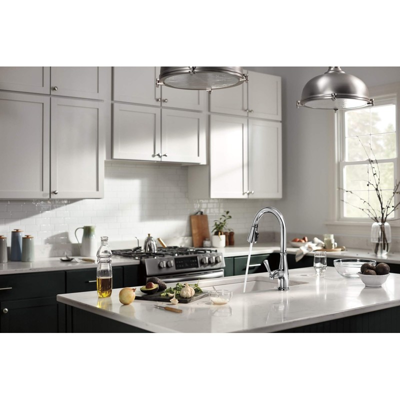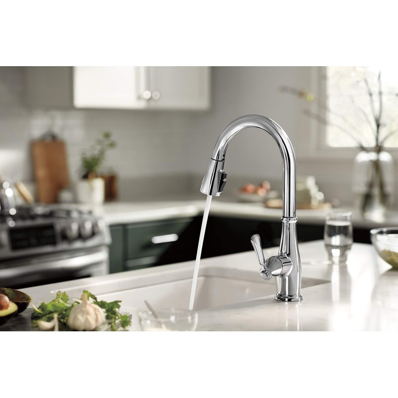 - The high-arc, gooseneck design swivels 360 degrees with a 20-in. retractable hose for added convenience during everyday kitchen tasks