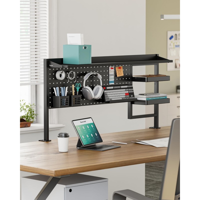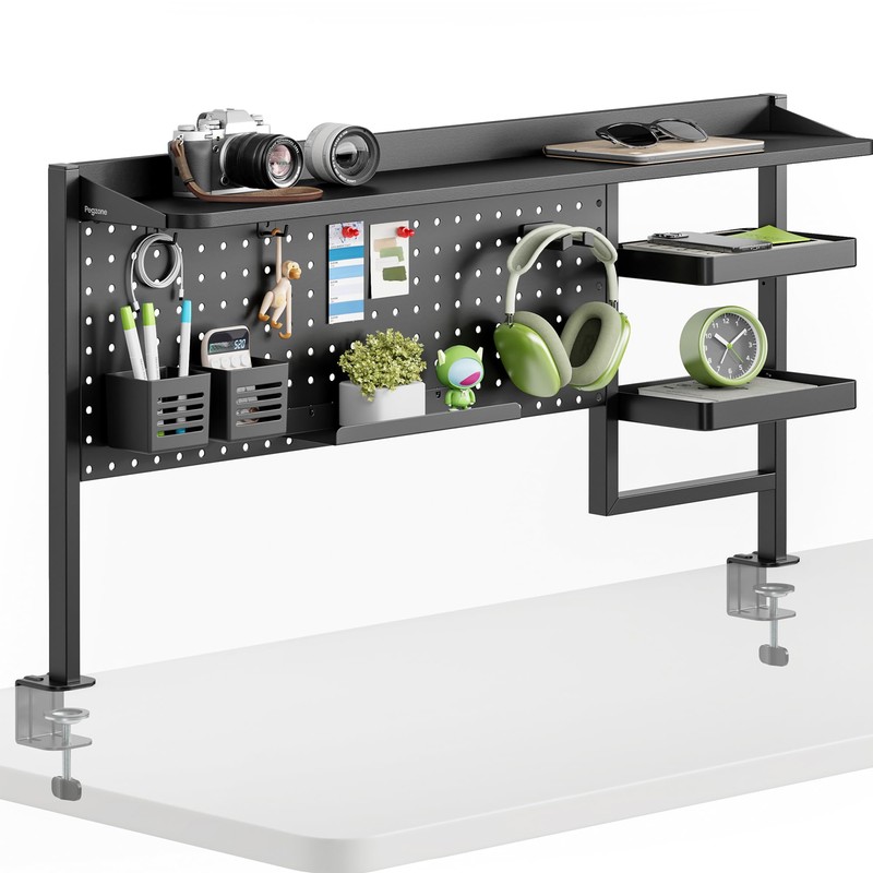 - 3-IN-1 MULTIFUNCTIONAL DESK ORGANIZER: This heavy-duty clamp on desk shelf combines a pegboard, a top storage rack and a two-tier shelf — all in one unit. Ideal for organizing daily essentials, it comes with multiple pegboard accessories including hooks, pen holders, headphone holder, storage tray, and magnets to create a personalized storage solution.