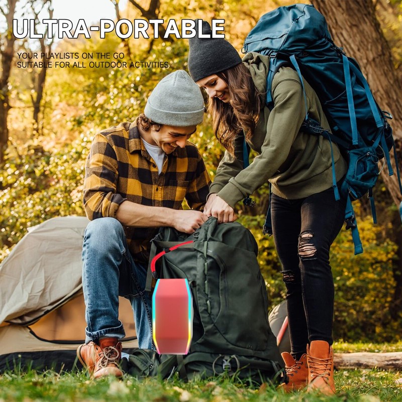 • 【Bluetooth 5.0 Portable Speaker】A new generation of Bluetooth 5.0 technology, has lower power consumption than Bluetooth 4.2 but with faster transmission,stronger anti-interference ability and more stable signal without any delay. Compact design, lightweight, and easy to carry. Portable bluetooth speaker with rugged rubber housing, built-in Lanyard so you can hang the portable speaker on backpack, bicycles, carts and anywhere you like, so it’s perfect for travel, riding, hiking, camping, and more outdoor/ indoors activities.