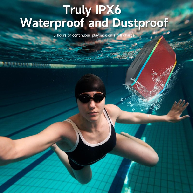 • 【IPX7 Waterproof Bluetooth Speaker】: This Portable Wireless Speaker Adopt IPX7 Design, well protection safeguards against rain, dust, snow, and spills, you can enjoy music in the swimming pool, beach, bathroom, and other places.It is also anti-shock and anti-damage. Even if the bluetooth speaker falls down at 1.5m high, it can still keep intact.