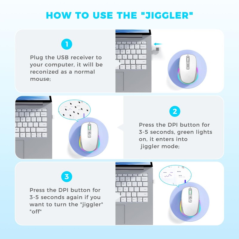 - Light Up Mouse & Mouse wiggler 2 In 1 -- If you working from home and was tired of being a slave to your computer, this mouse and jiggler in 1 could be your choice, just press and hold the DPI button 3-5seconds to set it on jiggler mode to keep your computer from locking when you have to step away