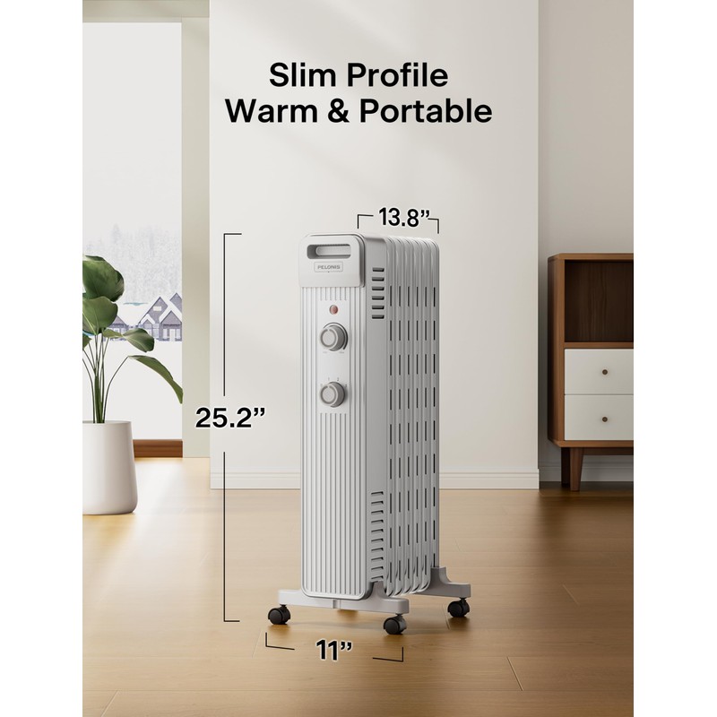 Pelonis Oil Filled Radiator Heater, 1500W Quiet Warmth Radiant Heater, 3 Heating Modes, Overheat & Tip-Over Protection, Adjustable Thermostat, Space Heaters for Indoor Use, White, 25.2 x 13.8 x 11 in