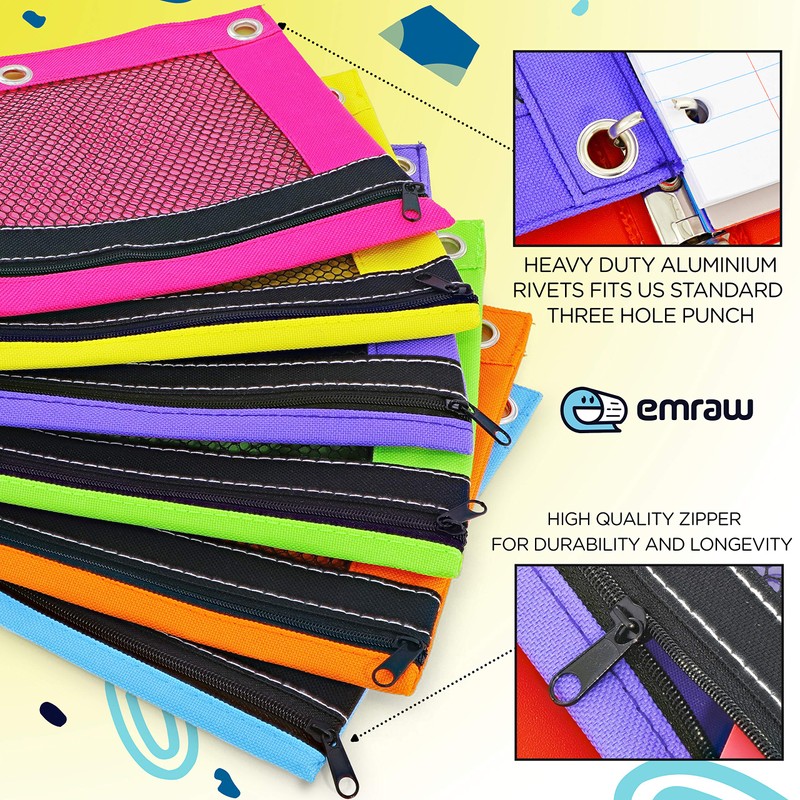 - ✓ The EmrawZippered Pencil Pouches with 3 - Ring Grommet Holes & Quick View Mesh & Clear Vinyl Pocket - Colours Included: Blue, Purple, Lime Green, Pink, Yellow, Orange is a suitable product to be used by the kids, students, and a number of others as well (Pack of 24).