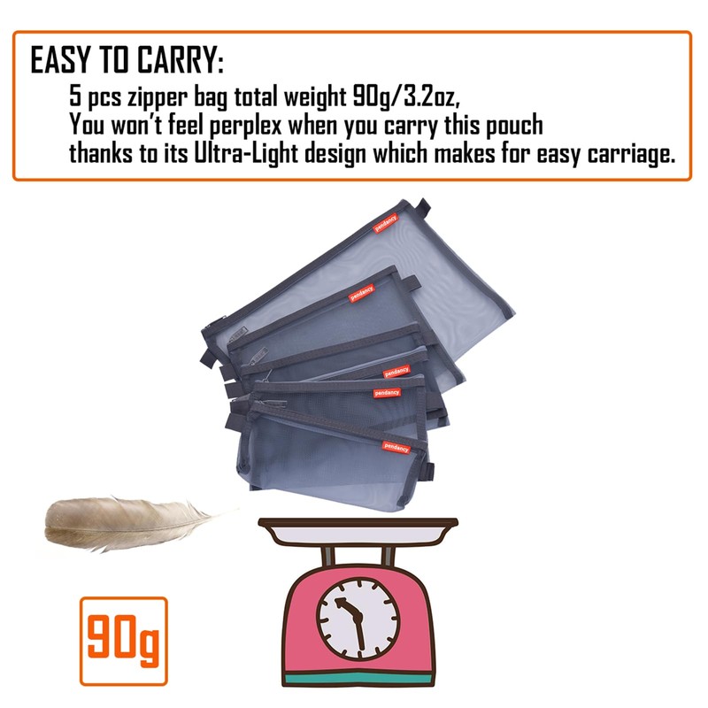 Pendancy Assorted Size Mesh Zip Wallet Nylon Ultra-light Office Travel Pouch Zipper Bag 5 Pcs (Grey, Assorted)