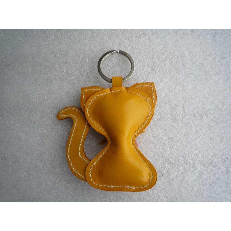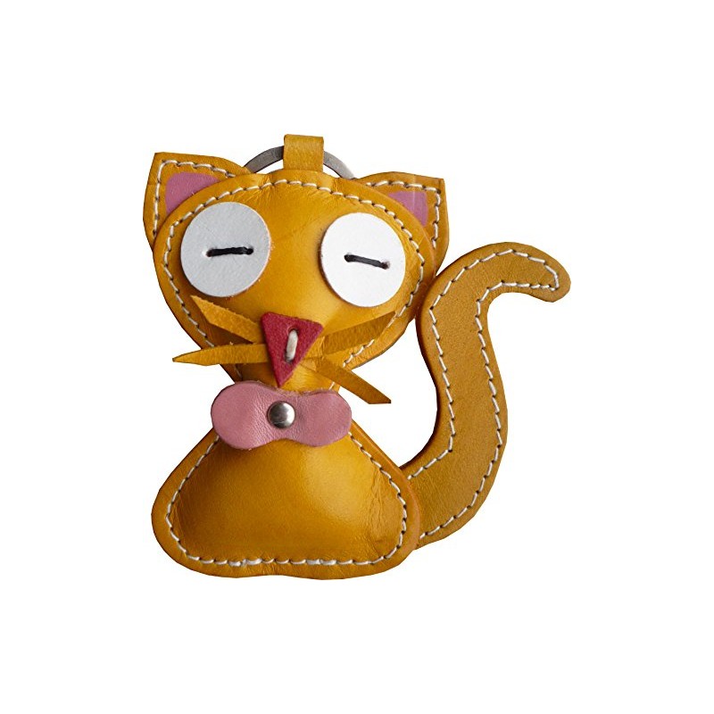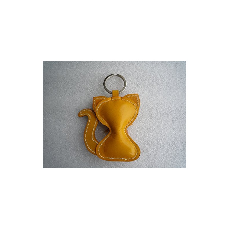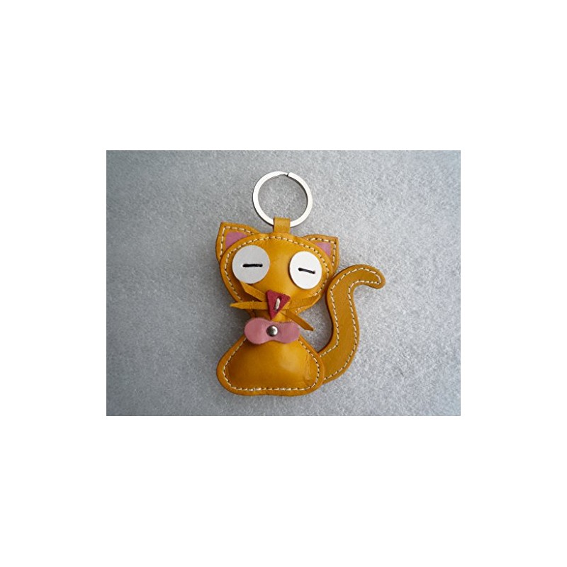 Pendant, Genuine Leather, Yellow, 7 x 5 cm Key Ring with Funny Cat (Cat)