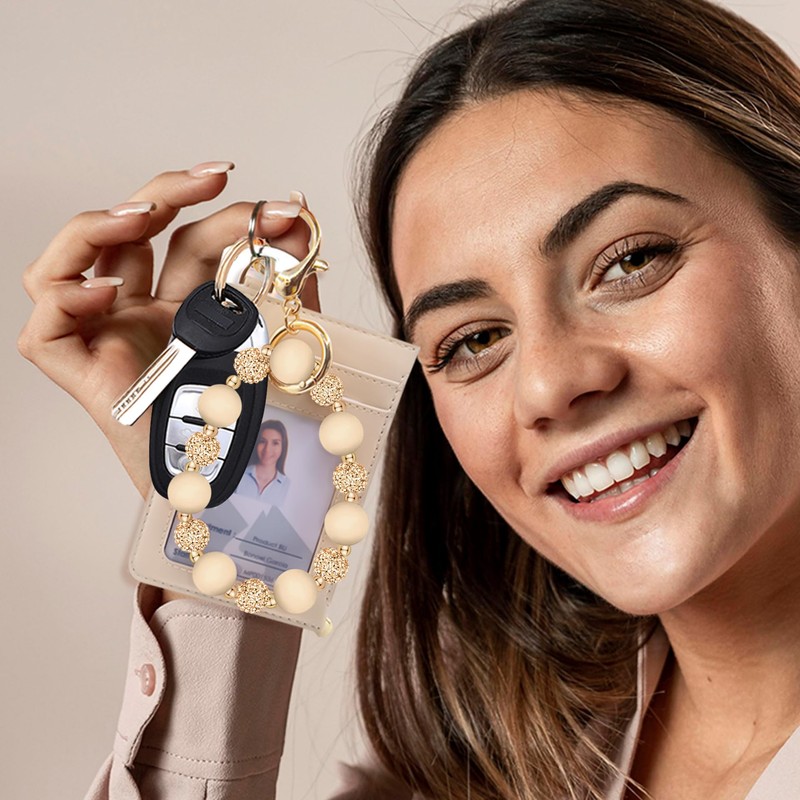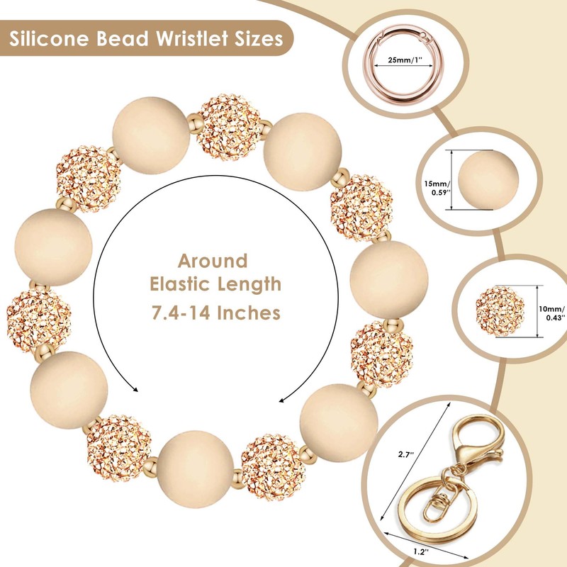 Penekin Keychain Wristlet, Silicone Beaded Wrist keychain for Women, Elastic Key chains for Car Keys (Beige Gold)