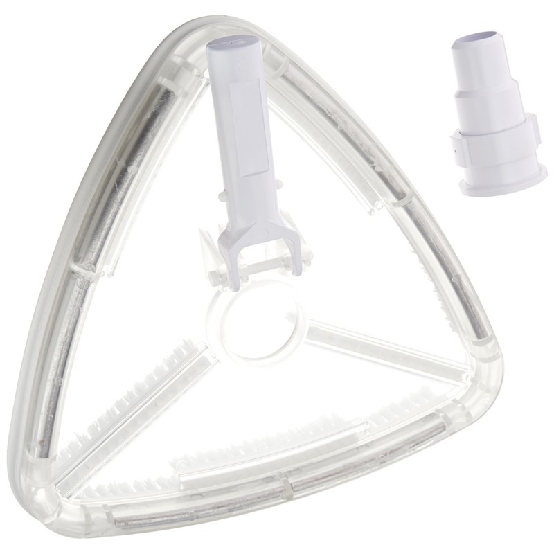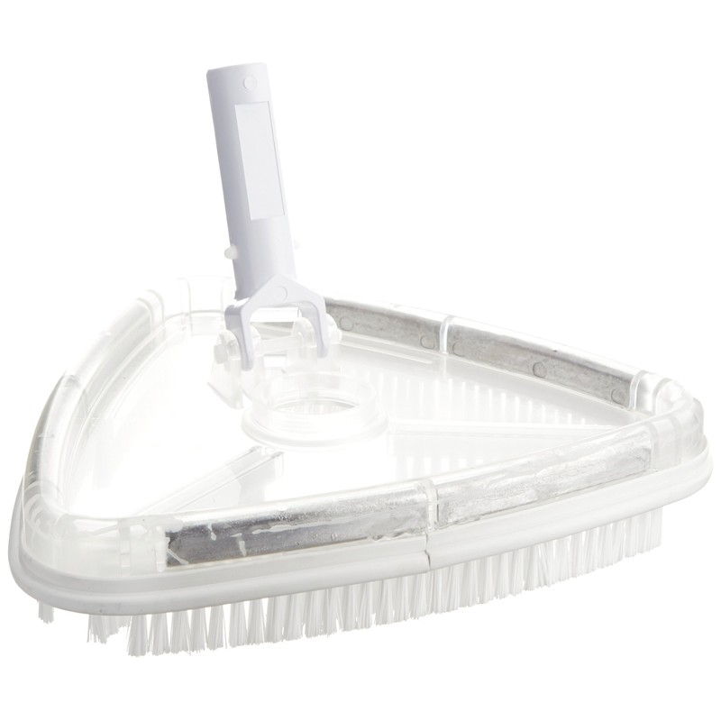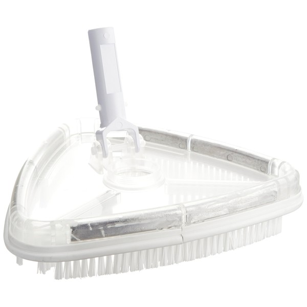 This clear view vacuum has triangular shaped, weighted see-thru design. Features 2 piece 1-1/4-inch 1-1/2-inch vacuum hose swivel connection which allows hose to move freely without twisting. Includes clam shell display pack. Cleans corners easily with protective vinyl bumper. Snap-adapt handle and replaceable adjustable brushes. Measures 14-1/2-inch length by 25-1/2-inch height by 13-3/4-inch width.