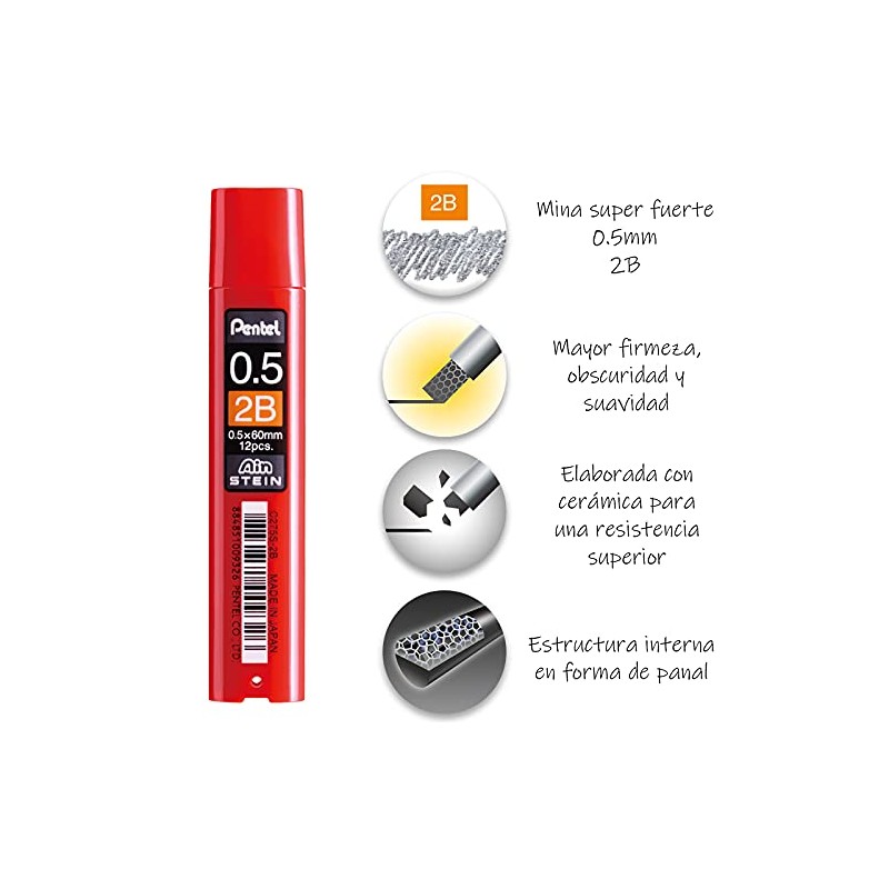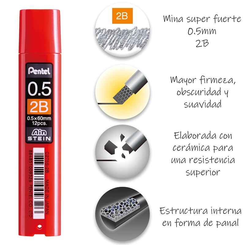 - Grado de dureza 2B; puntillas aptas para todos los portaminas de 0.5 mm