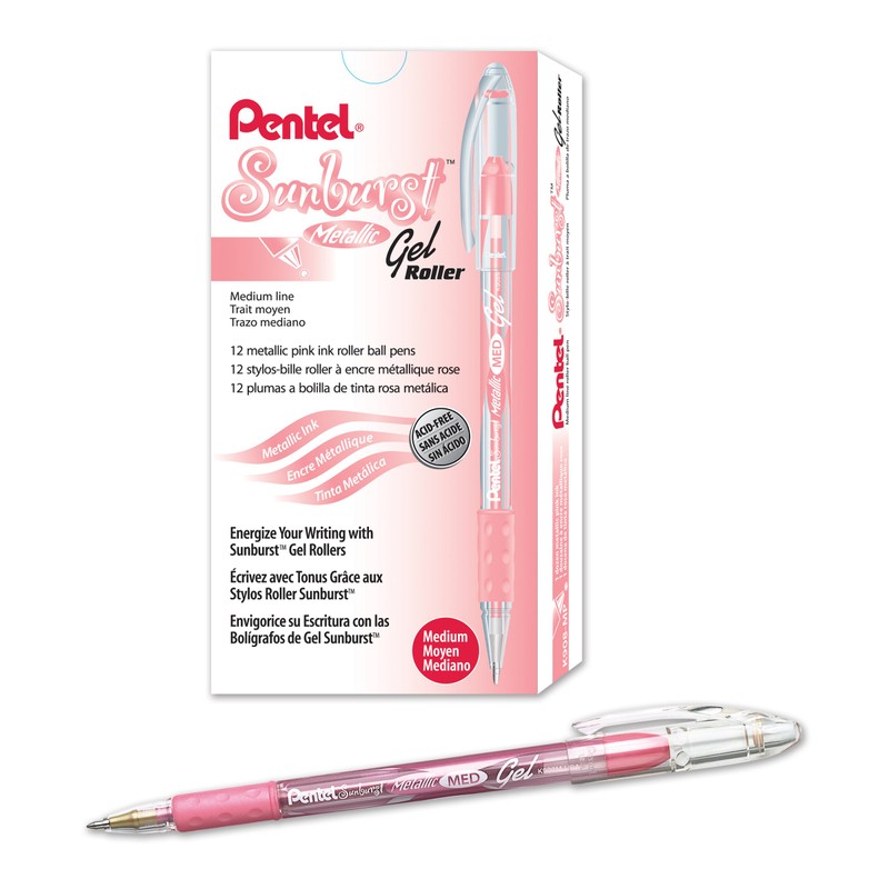 The Pentel® Sunburst Gel Pens feature sparkling metallic colors for use on light or dark paper. Fun metallic tones jazz up your page! Great for memory books, photo albums, journals, party invitations and more! Ultra-fine 0.4 mm Point for the ultimate precision. 0.4 mm Point lets you create clear, legible text — even in the tightest of spaces. Gel ink technology for a smooth flow! Fluid gel ink flows consistently from the tip so your page has no skips or messy ink blobs. Ink is waterproof, smear-resistant and acid-free. Ap certified non-toxic. Nonrefillable.