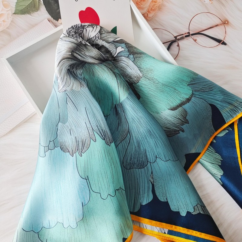 A: This scarf is made of 100% mulberry silk, giving it a luxurious and high-quality feel. It is square-shaped and measures 2121 inches (5353 cm), providing ample coverage and styling options. The scarf is incredibly lightweight and soft, ensuring maximum comfort when worn.