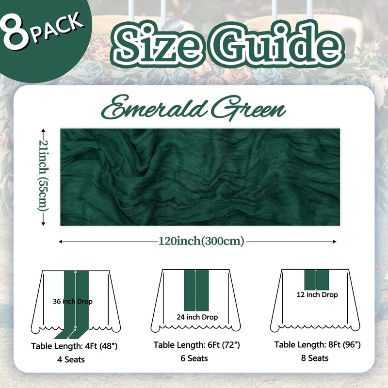 1. The package contains 8 packs of Emerald Green Table Runner, with a size of 21×120 inches, approximately 10 feet long, suit for tables that can accommodate 8 - 10 people. You can use them as your favorite decorations or for various activities. If you want to achieve the effect of the Emerald Green Cheesecloth Table Runner hanging on the floor, just gently place it on the table. These gorgeous and romantic Table Runners will add a unique charm to your dining table and enhance your dining experience to a higher level.