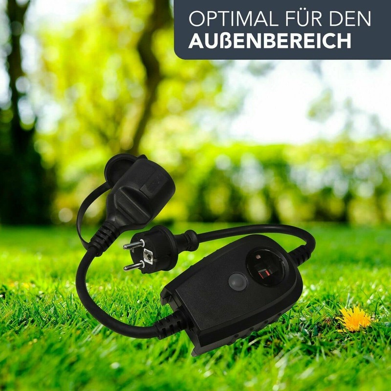 - Easy to use: easy connection via earthing contact socket: in the dark, the connected device switches on automatically. Perfect for e.g. garden lights, outdoor lights, spotlights, Christmas lights, etc.