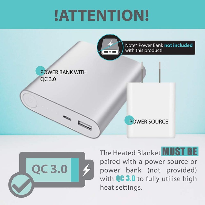 • Attention】: check your power bank has QC 3. 0 before purchasing this heated blanket