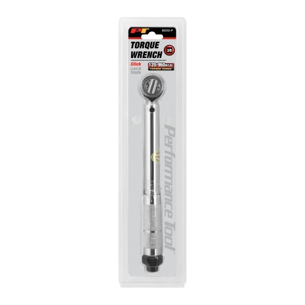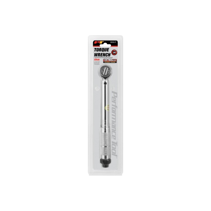 The Performance Tool M202-P 3/8-Inch Drive Click Torque Wrench is a precision tool designed for accurate torque applications. It features a 3/8-inch drive and a click-type mechanism that provides an audible click and tactile feedback when the preset torque value is reached. This helps prevent overtightening and ensures proper torque is applied to fasteners. With a torque range of 120 to 960 in. lbs., this wrench is suitable for a wide range of automotive, mechanical, and industrial applications. The durable construction and ergonomic handle make it comfortable to use and built to last. This torque wrench is an essential tool for professionals and DIY enthusiasts who require precise torque control.