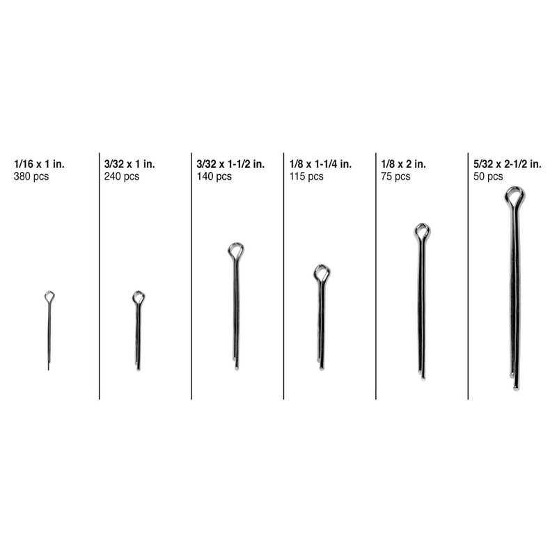 Performance Tool W5204 1,000-Piece Cotter Pin Assortment contains: 1/16-Inch by 1-Inch 380 pcs, 3/32-Inch by 1-Inch 240 pcs, 3/32-Inch by 1 1/2-Inch 140 pcs, 1/8-Inch by 1 1/4-Inch 115 pcs, 1/8-Inch by 2-Inch 75 pcs, 5/32-Inch by 2-1/2-Inch 50 pcs.