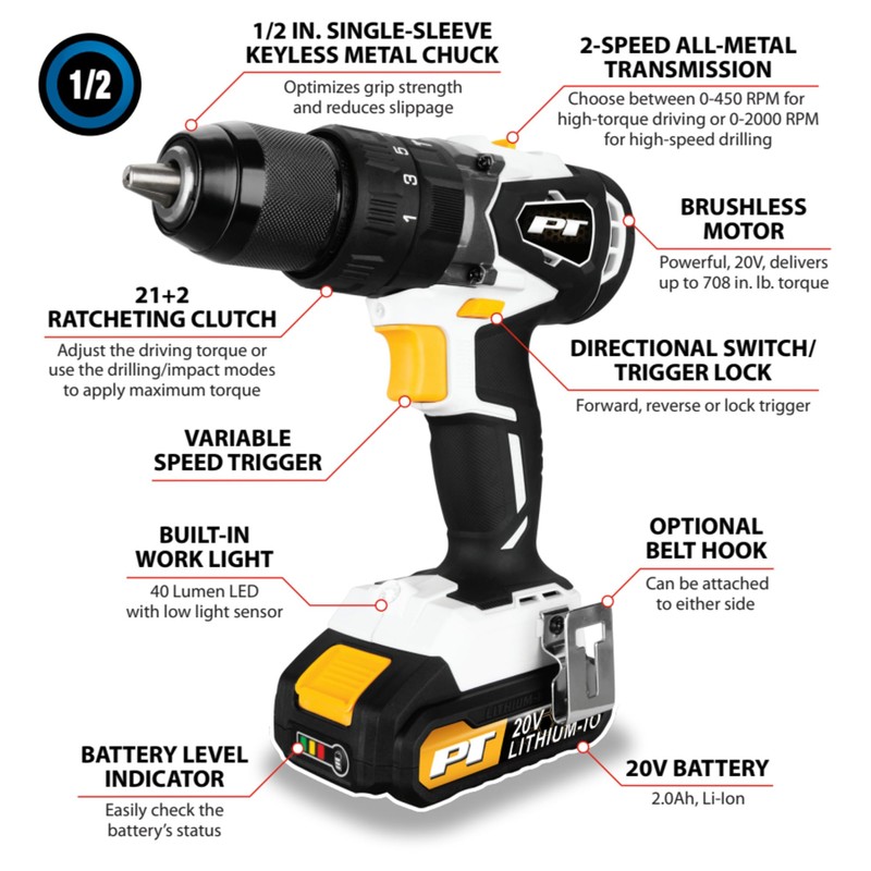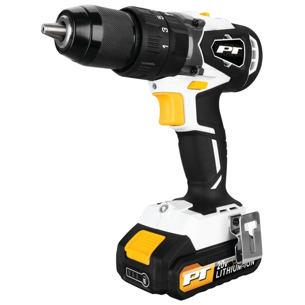 Performance Tool W7722 20V Li-Ion 1/2-in Brushless Hammer Drill: 708 in-lb Torque, 2-Speed, Keyless Chuck, 20V, USB-C Quick Charge, Built-In Hook, Storage Case, Black/White