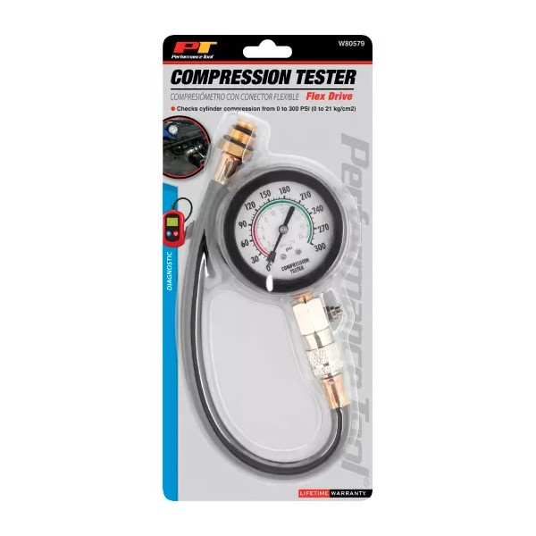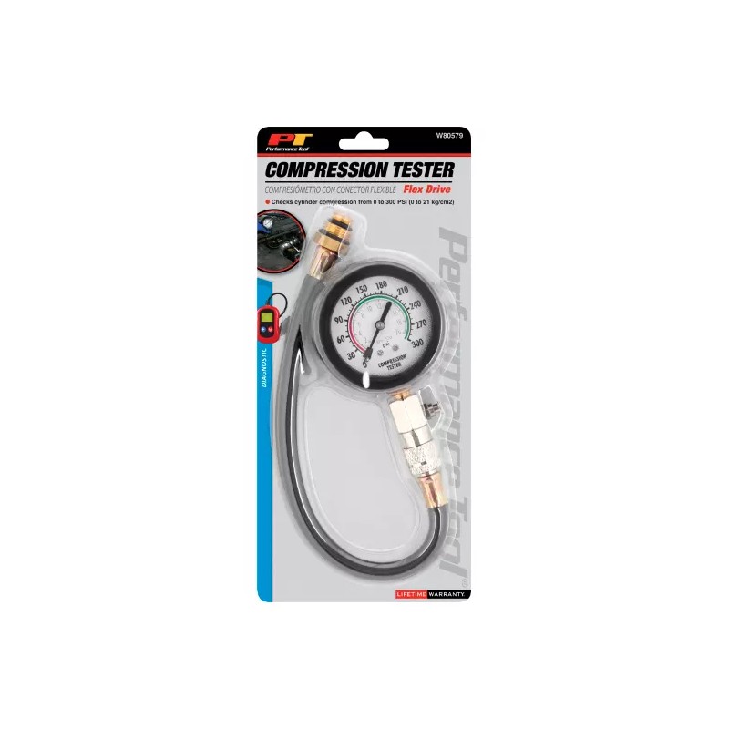 The Performance Tool W80579 Flex Drive Compression Tester is a versatile tool used to measure the compression pressure in an engine cylinder. It is commonly used in automotive engine testing and troubleshooting. The compression tester features a flex drive design that allows for easy access to hard-to-reach spark plug locations. It is designed to provide accurate and consistent compression readings, enabling precise diagnosis of engine performance issues. This tool is essential for automotive enthusiasts and professional mechanics for effective engine testing and maintenance.