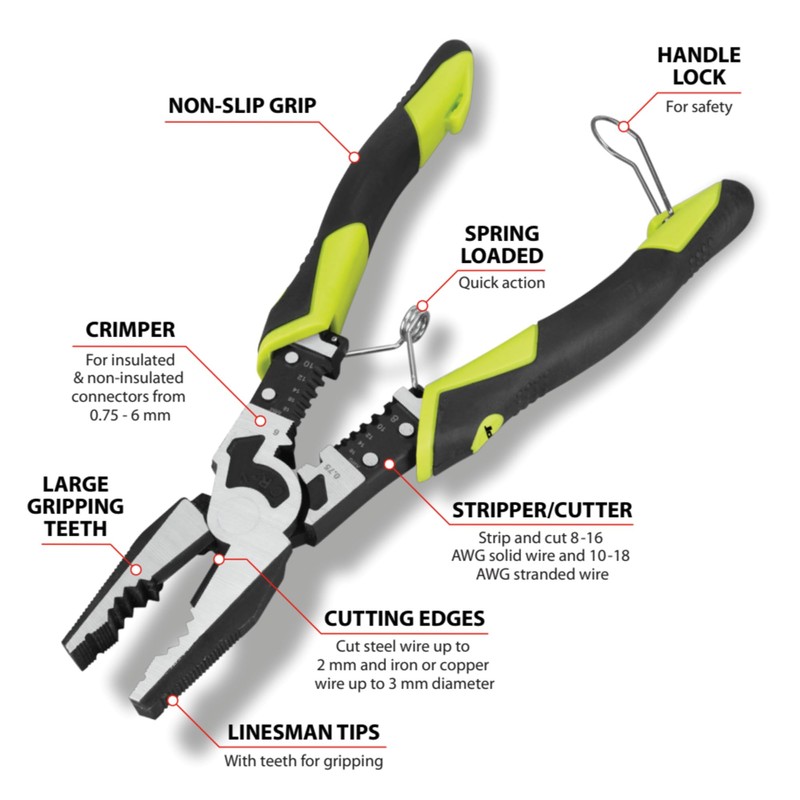 • Multifunction pliers and strippers allow you to cut, strip, crimp, twist, and grip for a range of electrical projects