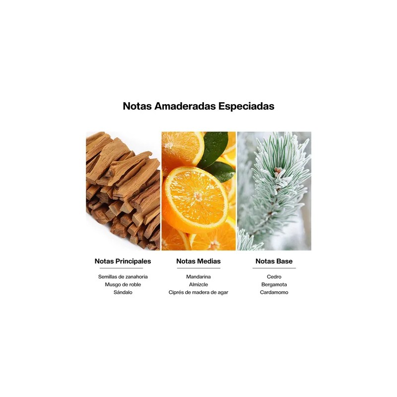 Notas de fondo: cedro amaderado seco + cardamomo dulce + final de limón ácido, creando una profunda y dulce sinfonía amaderada.