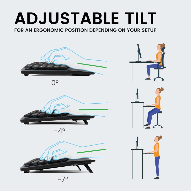 - Adjustable Tilt Wrist Rest: The integrated palm rest supports the palm and wrist while correcting the wrist pronation while typing to prevent unwanted pressure and muscle strains with 0, -4, and -7 degrees.