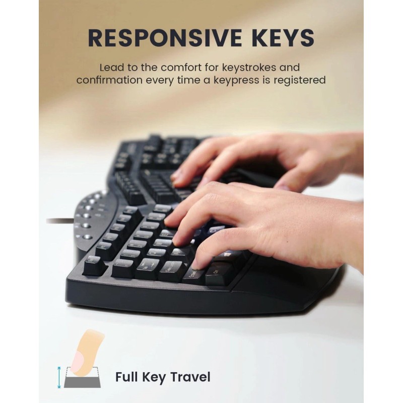 ERGONOMIC DESIGN - Split-key and 3-D design matches with to your natural arm and hand positions Integrated palm rest to support your wrists in a comfort position