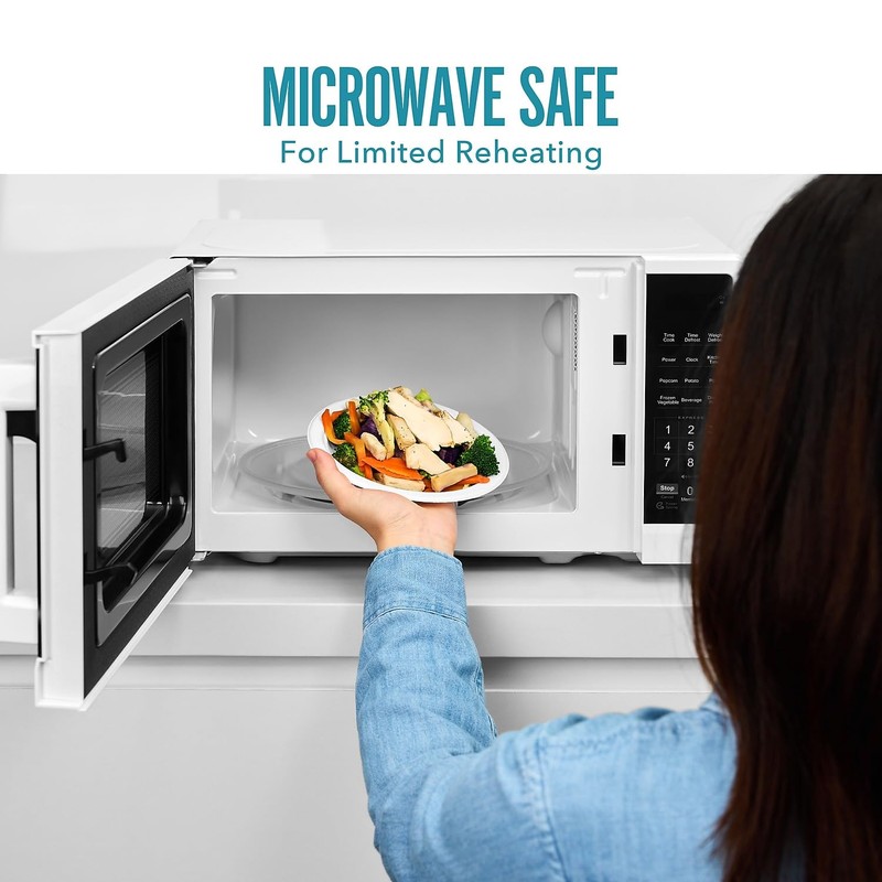 - PFAS-free compostable plate can carry a full meal without bending or soaking through
