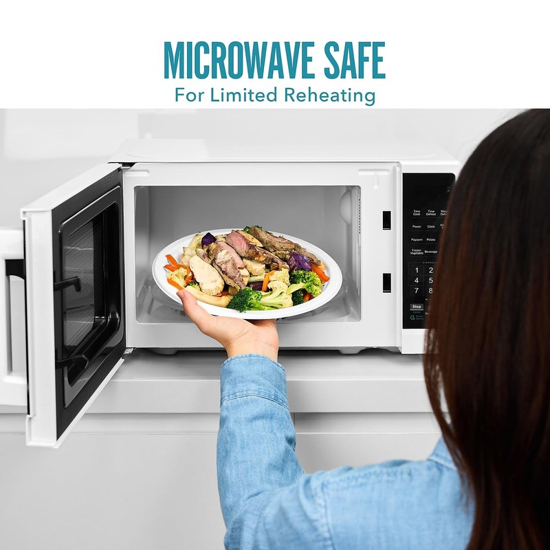 • Comes in white and crafted from bagasse, a sugarcane-based sustainable alternative to traditional paper plates