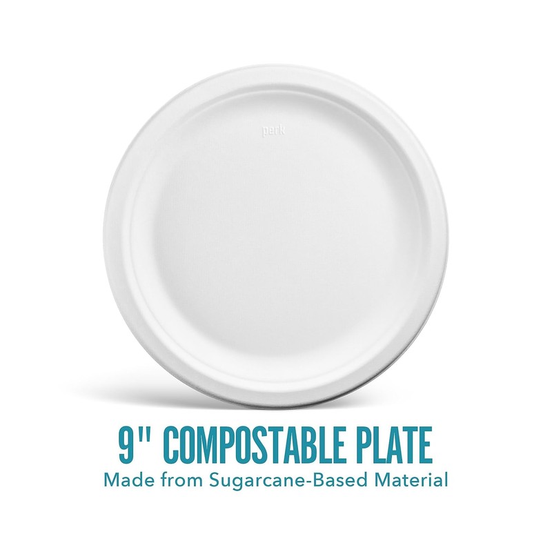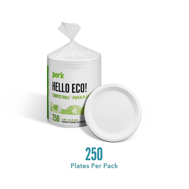 Perk Compostable Paper Plates, 9-inch, White, 250/Pack (PK61287)