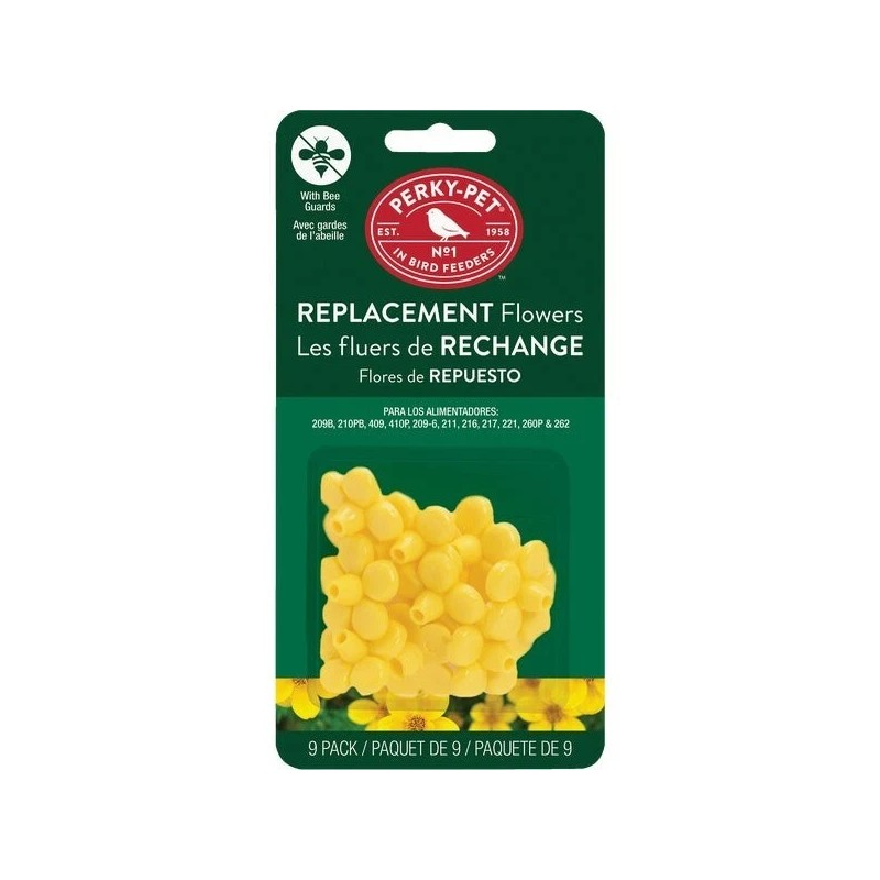 Perky-Pet replacement flowers with bee guards. Compatible with a variety of hummingbird feeders. Contains 9 yellow plastic flowers per pack.