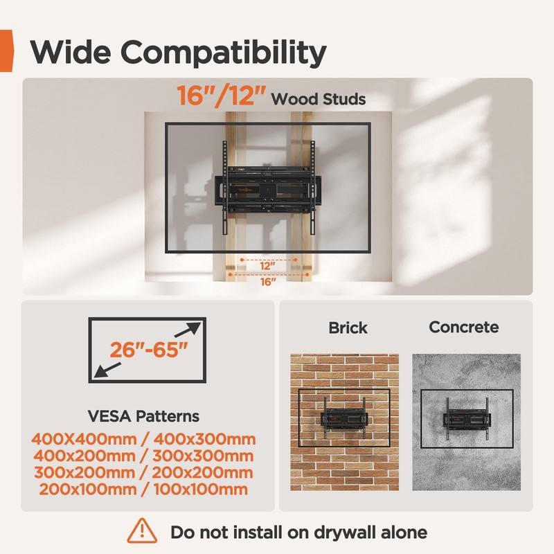 - Fast and Easy Installtion - Comes with all the required mounting hardware needed, a detailed English graphical installation guide and video that is actually useful which helps you to install this full motion TV wall mount without any hassle. This tv mount 50 inch can be mounted on brick wall, concrete wall and 8"12"16" wood studs.