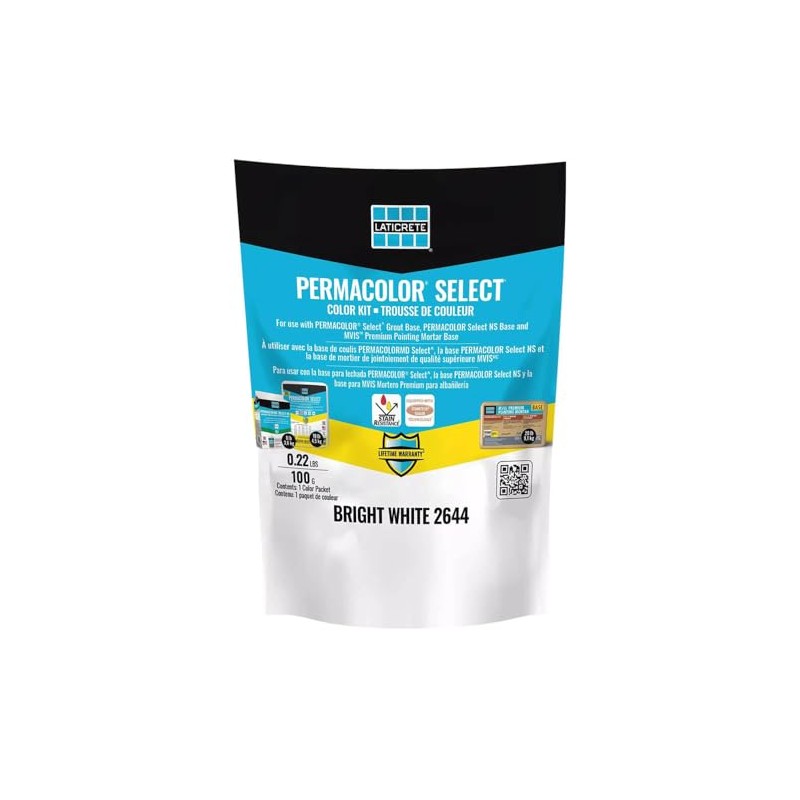 PERMACOLOR Select is an advanced high performance cement grout that offers the industry’s first dispensable dry pigment solution. PERMACOLOR Select is designed for virtually all types of residential and commercial installations and offers optimum performance on the most demanding exterior or interior applications. Easy to mix, grout and clean, PERMACOLOR Select is fast setting and is suitable for joints 1/16” to ½” (1.5mm–12mm) wide on floors or walls. Mixing Instructions 12.5 LB bag of PERMACOLOR Base(sold separately) - 1 Color Pack 25 LB bag of PERMACOLOR Base(sold separately) - 2 Color Packs