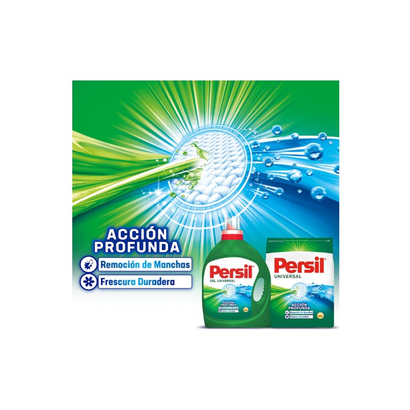 El detergente Gel Universal Persil es un producto de limpieza altamente eficaz que ha sido diseñado para proporcionar una limpieza profunda. Su fórmula de acción profunda penetra en los tejidos de la ropa, eliminando las manchas y la suciedad más difícil de manera efectiva. El detergente líquido de acción profunda es fácil de usar y se disuelve rápidamente en agua. Además, es adecuado para todo tipo de ropa, lo que lo hace muy versátil en su uso. Persil es un detergente que establece desafíos muy particulares desde hace casi 100 años. La pureza, el rendimiento y la protección de los textiles son el centro de nuestra investigación y desarrollo, con el fin de lograr el mejor resultado para usted, siempre