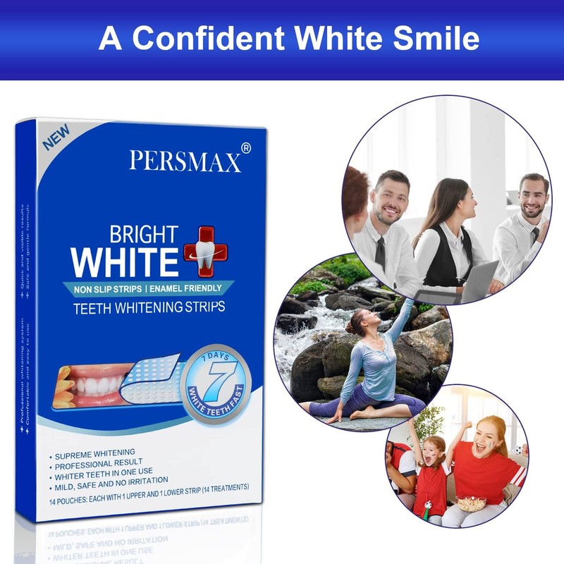 - 『PROFFESSOINAL TEETN WHITENING STRIPS』Formulated with new whitening ingredients, PERSMAX Teeth Whitening Strips can quickly and thoroughly dissolve tooth discolorations. It comes with 14 sets. Use one set a day to easily remove coffee, tea, tobacco, and other yellow stains.