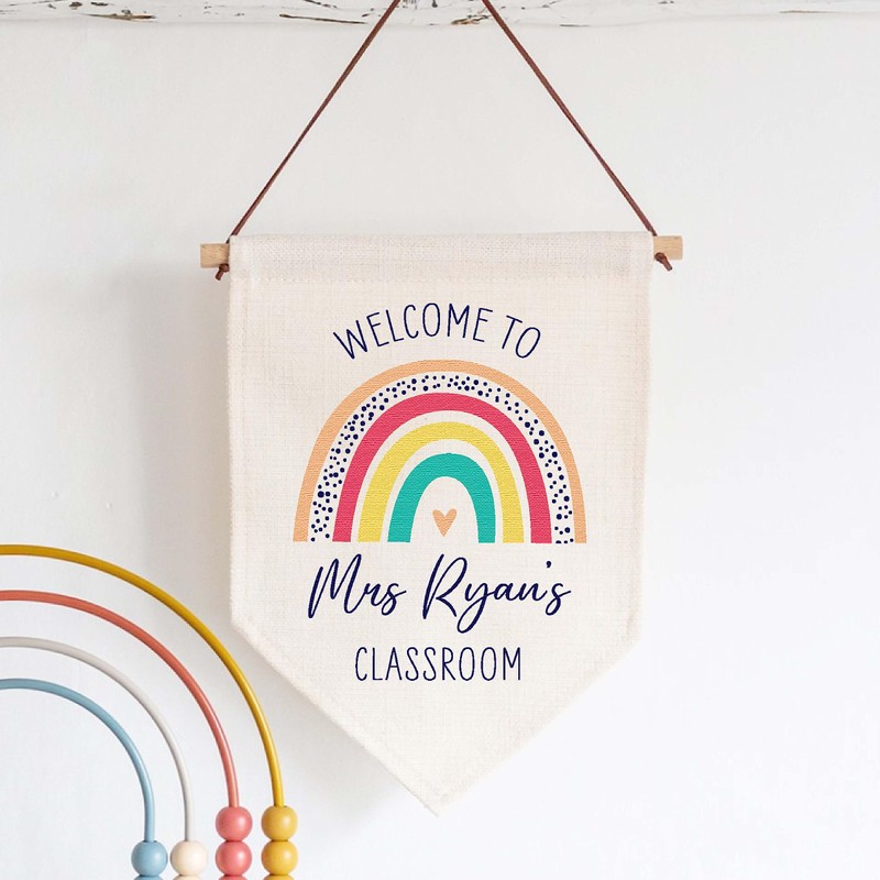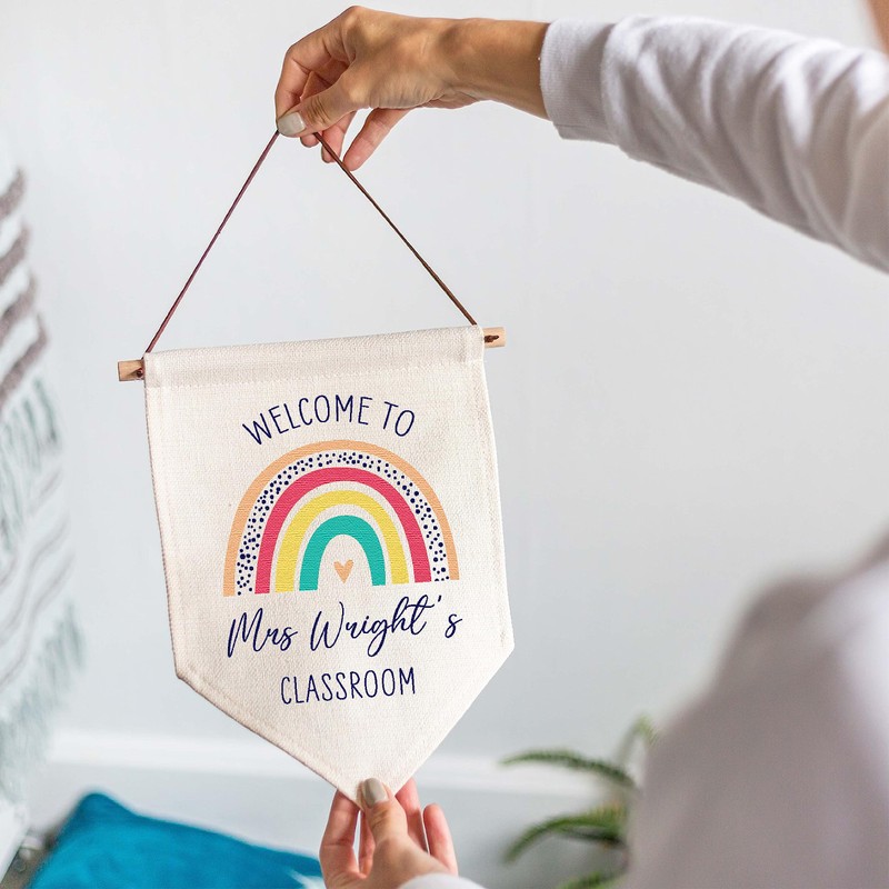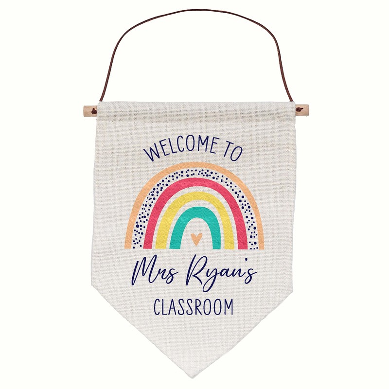 Personalised Teacher Rainbow Classroom Linen Style Hanging Flag Pennant Door Sign - End of Term Thank You Gift